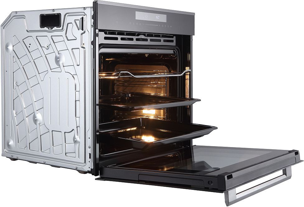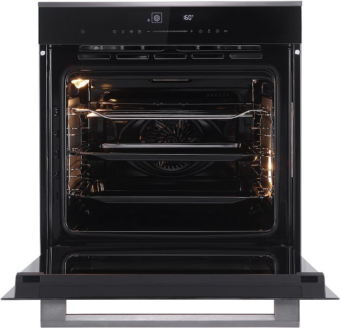 Элегантный встраиваемый прибор формата 56 см выполняет роль универсальной кухонной помощницы, сочетающей аккуратный внешний вид и продуманную функциональность. Черный корпус и LED-дисплей создают современную визуальную линию, а сенсорные переключатели поддерживают минималистичный стиль передней панели, делая управление интуитивно понятным. Откидная дверца с тремя стеклами и мягким доводчиком обеспечивает безопасный и плавный доступ к просторной камере объемом 72 литра, внутри которой установлено эмалевое покрытие легкой очистки — уход за внутренним пространством не отнимет много времени.
