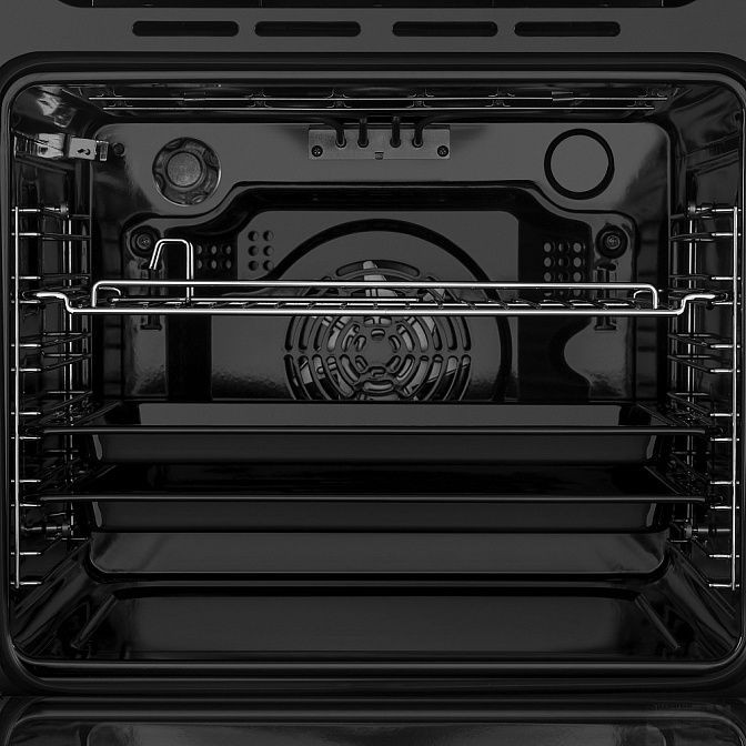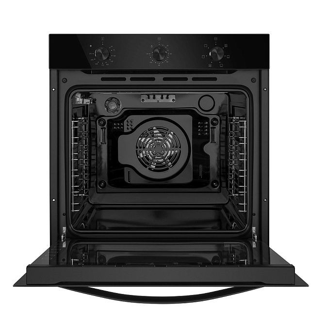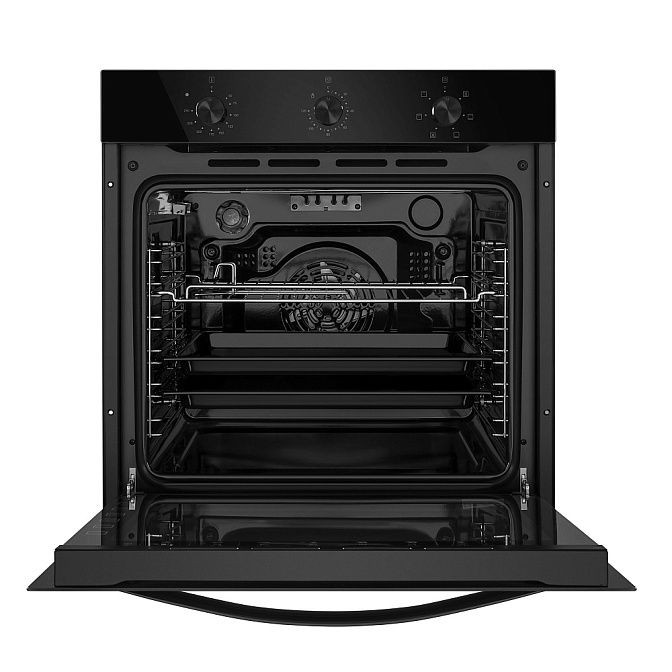Элегантная встраиваемая модель сочетает строгий черный корпус и аккуратную фурнитуру, создавая стильный акцент современной кухни. Металлическая ручка и утапливаемые поворотные регуляторы подчёркивают минималистичный облик и удобство управления: механические переключатели дают тактильную обратную связь, а LCD-индикация отображает оставшееся время, выбранный режим и текущую температуру. Просторная внутренняя камера объемом 76 литров покрыта эко-эмалью с легкоочищаемой поверхностью, что упрощает уход после интенсивного использования. Дверца с двумя стеклами сохраняет температуру и обеспечивает безопасное обращение; она съёмная, а направляющие телескопического типа доступны на первом уровне для удобной загрузки противней.
