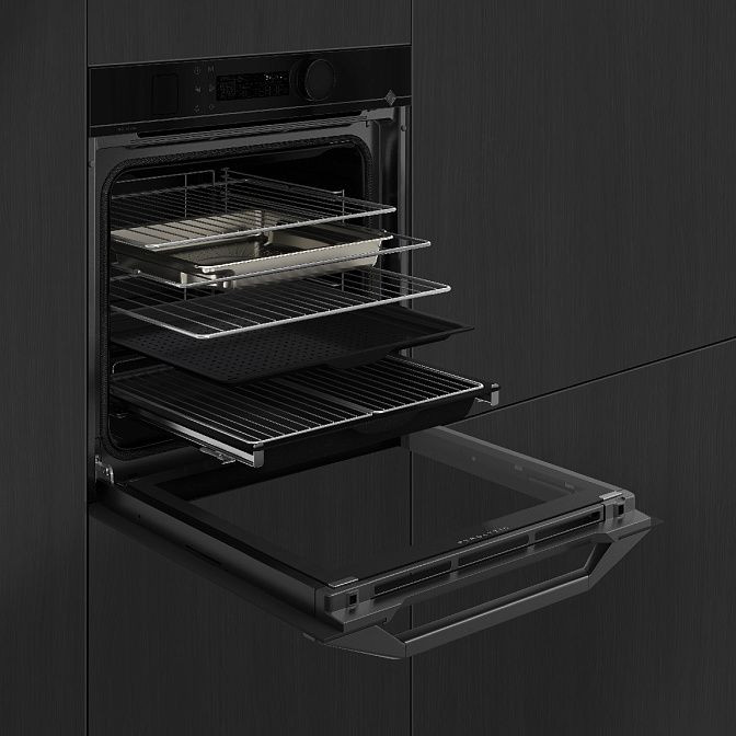 Вес устройства составляет 44,1 кг, а его размеры в упаковке — 67x64x66 см. В комплект поставки входят духовой шкаф, безопасная и складная решетки, противни различной глубины, противень для приготовления на пару и перфорированный противень. Особенности варочной панели включают режим паузы в приготовлении и поддержания температуры.
