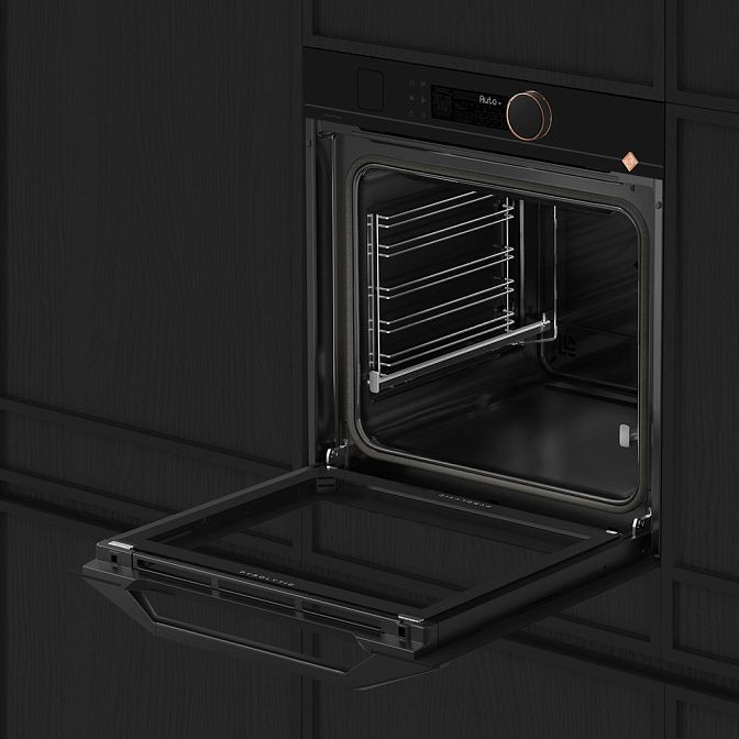Встроенный дисплей позволяет удобно управлять всеми функциями устройства. Черный и медный цвета придают духовому шкафу современный и элегантный вид. Панель управления расположена спереди, что обеспечивает легкий доступ ко всем функциям. Устройство оснащено таймером, а также функцией распознавания наличия и размера посуды.