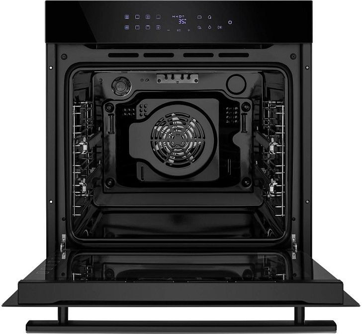 Современный бытовой прибор в черном корпусе сочетает стильную фасадную панель из стекла с металлическими деталями и минималистичной рукояткой из металла, обеспечивая аккуратный внешний вид для любой кухни. Компактные габариты (547x595x595 мм) и глубина ниши 600x564x560 мм позволяют разместить модель независимо, сохраняя пространство и удобство доступа. Передняя часть оснащена LCD-дисплеем и сенсорными переключателями, дополненными утапливаемыми поворотными регуляторами, что делает управление интуитивным: выбор режима, установка времени и контроль температуры выполняются быстро и точно. Внутренняя камера большого объема (76 л) покрыта _ko-эмалью легкой очистки, которая минимизирует пригар и облегчает уход; сплошное внутреннее стекло дверцы также снабжено легкоочищаемой поверхностью, а конструкция с тремя стеклами и съемной дверцей повышает теплоизоляцию и безопасность.