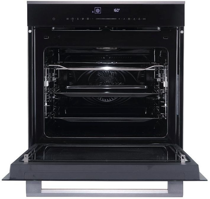 Элегантный корпус в черном цвете с фронтальной поверхностью из металла и стекла создает стильный акцент на кухне и при этом удобен в уходе. Нержавеющая ручка подчеркивает премиальность отделки, а три слоя стекла в дверце и холодная поверхность обеспечивают безопасность при эксплуатации. LED-дисплей и сенсорные переключатели вместе с утапливаемыми поворотными регуляторами дают гибкие варианты управления: можно быстро задать температуру, выбрать программу или воспользоваться отложенным стартом и таймером с отключением. Панель выглядит лаконично, обеспечивает интуитивное управление и аккуратно интегрируется в кухонный гарнитур при независимой установке.