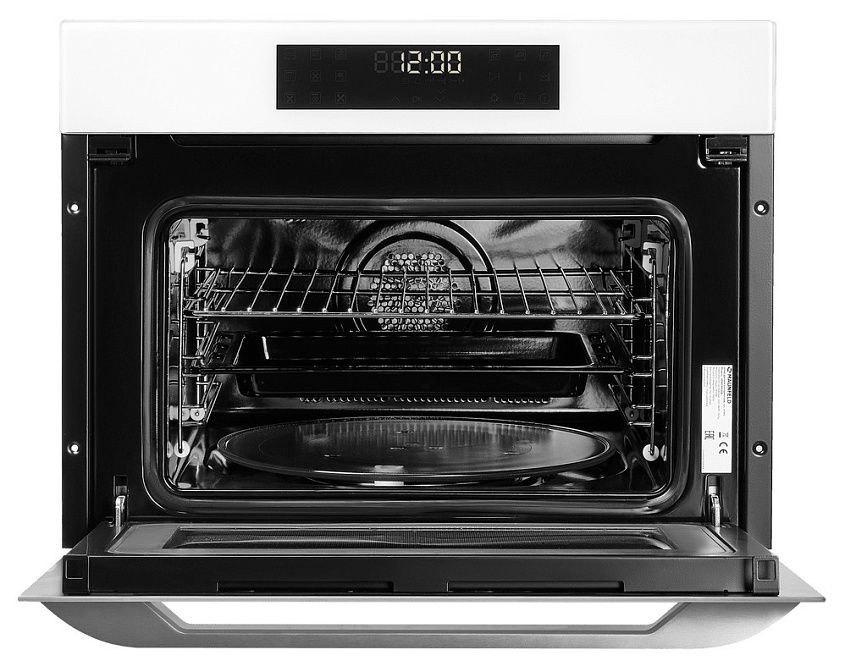 Внутреннее пространство шкафа оснащено подсветкой, что обеспечивает удобство при контроле процесса приготовления. Вместительный объем в 44 литра позволяет готовить большие порции еды, а четыре уровня размещения противней обеспечивают возможность одновременного приготовления нескольких блюд.