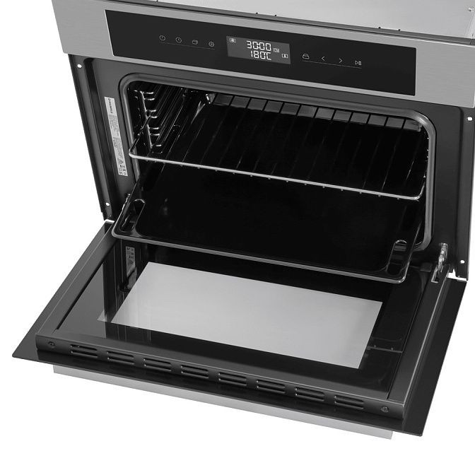 Внутренний объем духовки составляет 45 литров, что обеспечивает достаточно места для приготовления больших порций еды. В комплекте с духовым шкафом идут решетка для гриля и противень для выпечки, что делает его еще более универсальным прибором для приготовления пищи.