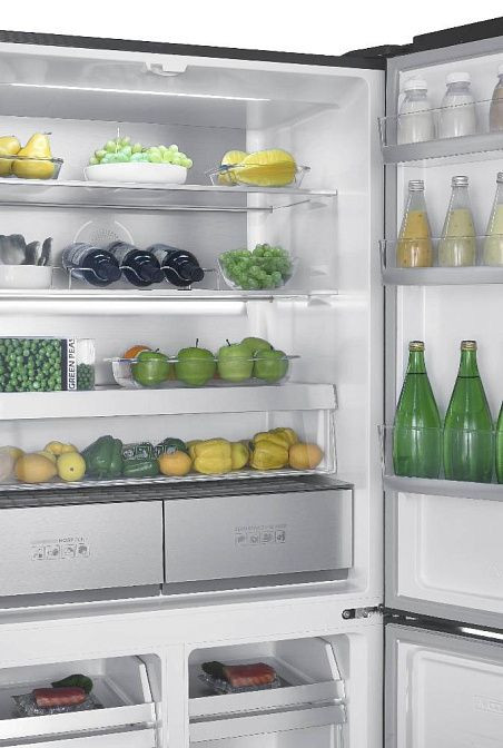 Внутренняя организация рассчитана на продуманное хранение: общий полезный объем 512 литров распределен между тремя камерами — холодильной с 364 л и морозильной с 148 л, дополнена зоной свежести. Наличие двух независимых температурных зон и двойной системы охлаждения с инверторным компрессором и хладагентом R600A обеспечивает стабильное поддержание параметров и препятствует смешению запахов. Полки из стекла, в том числе выдвижные и съемные, коричневого цвета и одна деревянная полка под углом 45° для демонстрации, вместе с 6 внутренними полками на дверце и 4 выдвижными лотками в морозильной части гарантируют удобство укладки. Для любителей напитков предусмотрена откидная металлическая подставка для бутылок и общая вместимость до 56 бутылок, а контейнер для воды и ледяной лоток дополняют функционал.