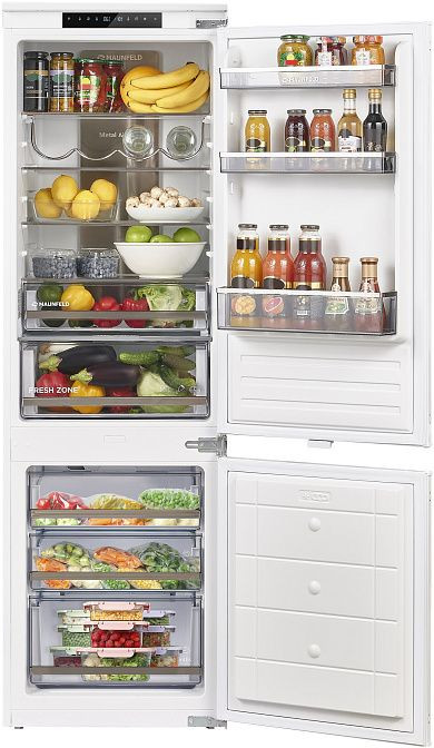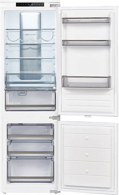 Элегантный полно встраиваемый двухкамерный холодильник сочетает аккуратный белый цвет фронтальной поверхности с прочным металлическим корпусом, что делает его органичным решением для современного интерьера. Его высота 178,5 см, ширина 55 см и глубина 54 см позволяют скрыть технику за фасадом кухонного гарнитура без ущерба для объема: общий полезный объем рассчитан с учетом 179 литров холодильной камеры и 66 литров морозильного отделения, а зона свежести предоставляет дополнительные 25 литров для овощей, фруктов и деликатных продуктов. Удобная конфигурация полок (4 стеклянные плоскости) и 3 полки на двери обеспечивают гибкость размещения, в морозильной части предусмотрены 3 выдвижных ящика и 2 полки для аккуратного хранения замороженных запасов. Ниша для встраивания соответствует размерам 1771—1774x560x560 мм, что упрощает установку и маскировку техники под мебельный фасад.