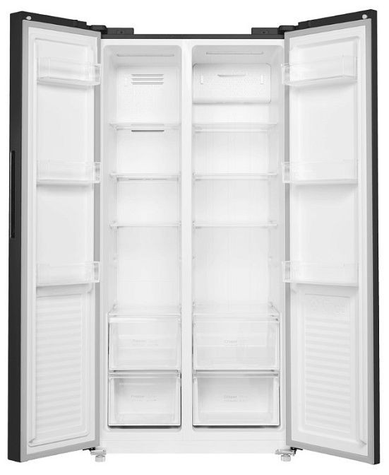 Этот вместительный Side-by-Side в черном исполнении объединяет элегантный стеклянный фронт и надежный металлический корпус со стальными боковинами, создавая современный и цельный образ для кухни. Модель выполнена в формате с морозильной камерой справа или слева, имеет два дверных полотна и полноразмерную цилиндрическую ручку, что обеспечивает удобство доступа при любом варианте расположения. Прямая установка с жестким креплением door on door позволяет монтировать прибор вплотную к стене, а регулируемые ножки дают возможность точной подгонки по уровню, при этом габариты 177x91,2x70,4 см делают аппарат заметным, но гармоничным элементом интерьера.