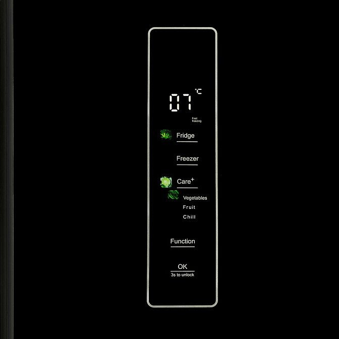 Управление холодильником осуществляется с помощью сенсорного и электронного управления, расположенного на дверце. Цифровой дисплей позволяет легко контролировать температуру в холодильной и морозильной камерах, а также следить за режимом работы устройства. Индикация открытой двери холодильной камеры и повышения температуры обеспечивает дополнительную безопасность использования.