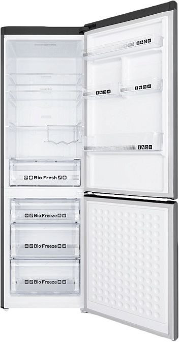 В холодильной камере, объемом 232 литра, установлены стеклянные полки, обрамленные рамкой, и есть специальное отделение для бутылок. В морозильной камере, объемом 98 литров, предусмотрены три ящика для хранения замороженных продуктов.