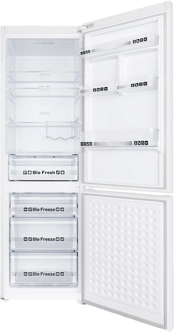 Морозильная камера, расположенная снизу, обеспечивает удобный доступ к замороженным продуктам. Система No Frost предотвращает образование инея в обеих камерах, что облегчает процесс ухода за холодильником. Минимальная температура в морозильной камере достигает _23 градусов Цельсия, что позволяет сохранять свежесть продуктов на долгое время.