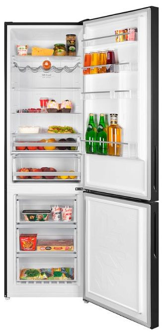 Элегантный черный корпус с металлическими дверцами и боковыми панелями формирует современный и строгий образ, который органично впишется в интерьер кухни в стиле минимализм или хай-тек. Высота 200 см и стандартная ширина около 60 см позволяют установить прибор отдельно стоящим или встроить в нишу с размерами 194—195x56—57x56 см; конструкция предусматривает перенавешивание дверей и скользящее крепление для удобства монтажа. Ручки из металла имеют темный оттенок и выполнены в скрытом дизайне, что добавляет аккуратности и упрощает уход, а замок обеспечивает дополнительную безопасность для семьи или бизнеса. Внутренняя планировка продумана для рационального размещения продуктов: четыре выдвижные стеклянные полки бежевого цвета с регулировкой высоты, шесть держателей на дверце, площадка для бутылок и подставка для яиц дают простор для организации пространства, а большой ящик и два контейнера для овощей и фруктов сохраняют свежесть за счет регулируемой влажности в зоне свежести.