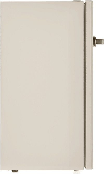 Холодильник выполнен в бежевом цвете, что делает его универсальным для любого интерьера. Корпус из металла обеспечивает долговечность и надежность. Внутри холодильника имеется две полки из стекла в рамке, которые можно легко очищать.
