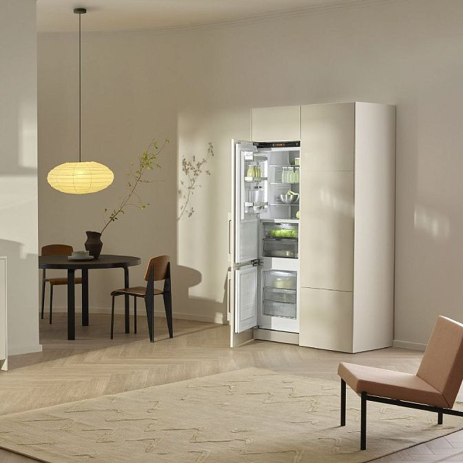 Элегантный встраиваемый двухкамерный холодильник сочетает современный дизайн Black Velvet с функциональностью, необходимой для кухни премиум-класса. Фронтальная поверхность выполнена из металла и стекла, дверцы — прозрачные со стеклом, защищенным от УФ-лучей, а матовые черные ручки гармонично дополняют общую эстетическую концепцию. Корпус из прочного металла и аккуратные боковые стенки выдерживают интеграцию под фасад вашего гарнитура, при этом возможна установка с правым или левым открыванием благодаря перенавешиваемым, распашным дверцам; угол открытия достигает 90°—94°, что упрощает загрузку крупной посуды. Внутреннее пространство организовано с заботой о порядке: стеклянные полки в рамке, в том числе наклонная полка для бутылок, пять регулируемых полок на дверце и несколько вместительных ящиков, включая большой отдел для овощей и фруктов, обеспечивают удобство хранения. Для хранения напитков предусмотрено до 56 мест для бутылок, также предусмотрен лоток для кубиков льда и подставка для яиц.