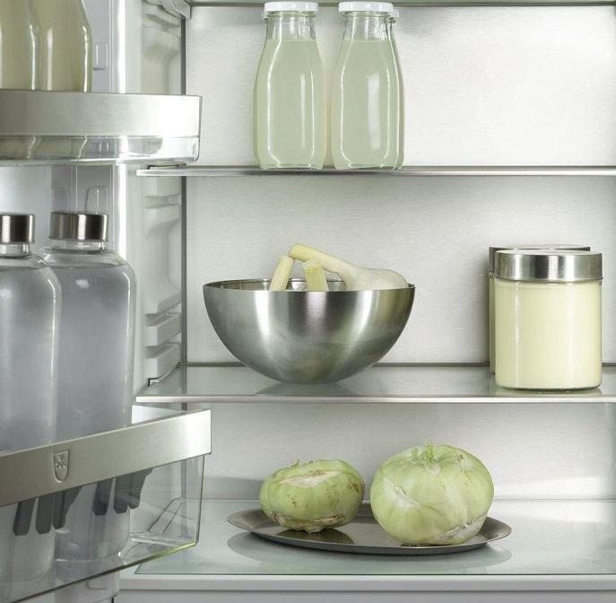 - Стеклянные дверцы с УФ-защитой, матовые ручки и стеклянные полки создают стильный внешний вид и удобство в уходе, идеально для встроенной кухни.