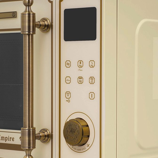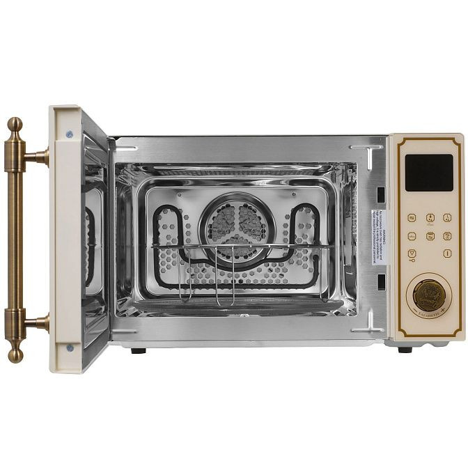 Элегантный бежевый корпус контрастирует с блеском нержавеющей стали внутренней камеры и создает аккуратный внешний вид, подходящий для любой кухни. Компактные габариты 30,3x51x41 см и вместимость 23 литра делают прибор удобным решением для ограниченного пространства, при этом внутри достаточно места для блюд на поворотной тарелке диаметром 27 см. Эргономичная ручка дверцы обеспечивает комфортное открывание вправо, а встроенная подсветка камеры позволяет контролировать процесс приготовления без лишних действий. Сенсорная панель и информативный дисплей гарантируют легкое задание параметров, а современная система управления упрощает выбор нужного режима даже при ограниченном опыте работы с кухонной техникой.