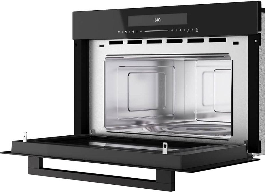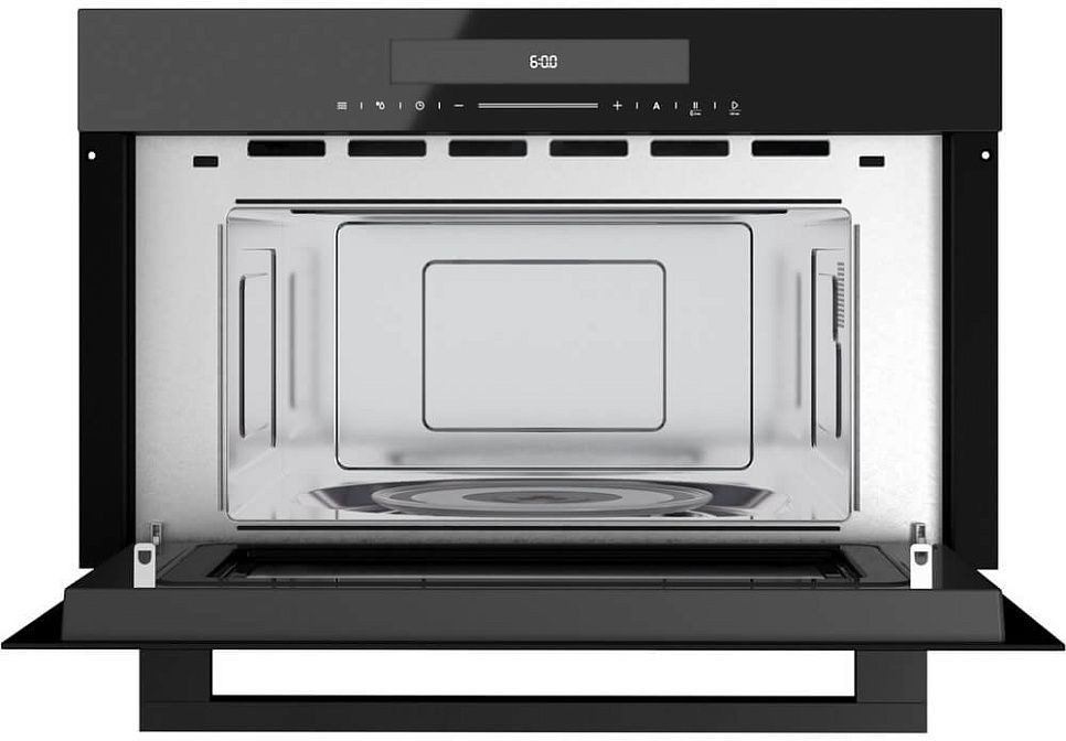 Элегантный корпус черного цвета создан для гармоничного встраивания в современную кухонную мебель и аккуратно завершает интерьер за счет строгих линий и минималистичной передней панели. Панель управления с сенсорными клавишами и информативным дисплеем обеспечивает быстрый доступ к функциям и сохраняет чистоту внешней поверхности: никаких лишних выступающих элементов, только удобная ручка для открывания дверцы. Внутреннее покрытие выполнено из нержавеющей стали, что упрощает уход и повышает долговечность камеры при интенсивной эксплуатации; встроенная подсветка позволяет контролировать процесс приготовления без дополнительного освещения. Компактные габариты при полезном объеме 34 литра помогают разместить прибор в нише со стандартными размерами 382x595x456 мм, сохраняя простор для тарелки диаметром 34,5 см и удобство загрузки средних по размеру емкостей.