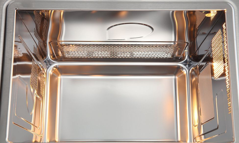 - Встроенный дизайн и металлическая передняя панель создают современный внешний вид и аккуратно вписываются в кухонный гарнитур.