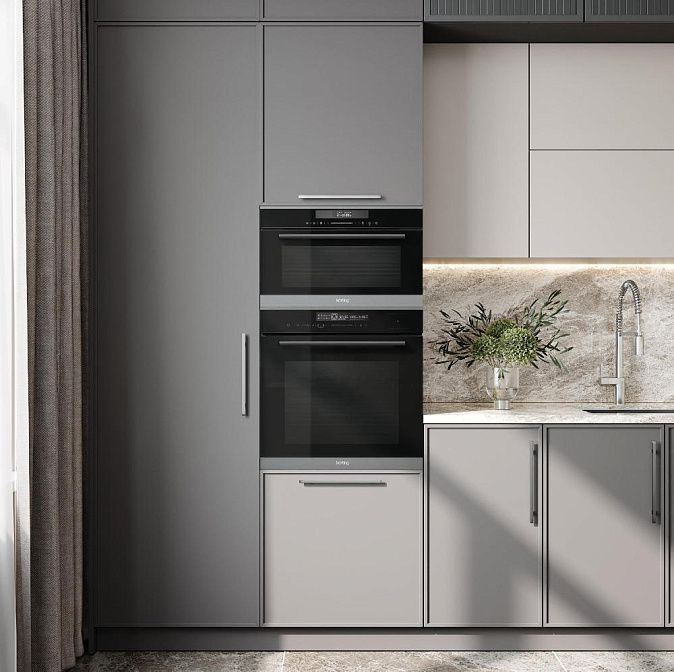 Эта встроенная модель сочетает в себе современный внешний вид и продуманные технические решения для кухни. Черный корпус с фурнитурой из нержавеющей стали выглядит лаконично и уместно в любом интерьере, а покрытие, устойчивое к отпечаткам пальцев, сохраняет ухоженный вид без лишних усилий. Откидная дверца с ручкой и двойным стеклом обеспечивает надежную теплоизоляцию и удобство доступа; дверной упор снизу гарантирует корректное закрытие встраиваемой камеры. Для монтажа предусмотрены габариты 382x596x456 мм (высота, ширина, глубина) и рекомендуемая ниша 380x560x500 мм, при этом ширина встраивания составляет 56 см.