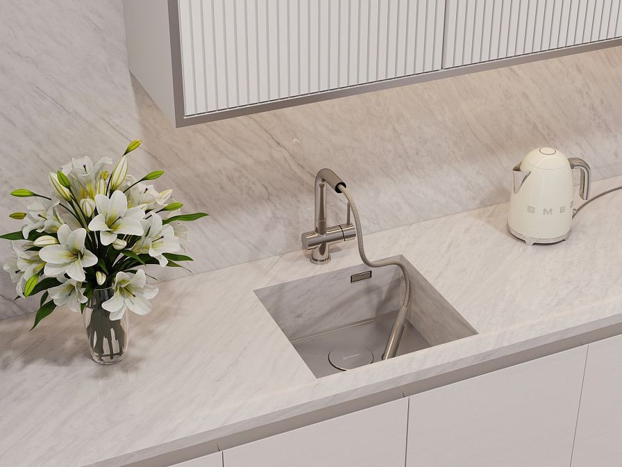 Материал столешницы мойки отсутствует, что позволяет интегрировать ее в любой интерьер. Также стоит отметить, что мойка имеет одну основную и одну дополнительную чашу. Это делает ее удобной для использования, позволяя разделить посуду на грязную и чистую.