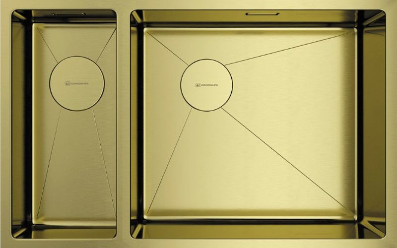 Прямоугольная форма оптимально использует пространство малогабаритной кухни. Светлое золото гармонирует с классикой, ар-деко и современными стилями. Смещенный слив освобождает место под мойкой для измельчителя.