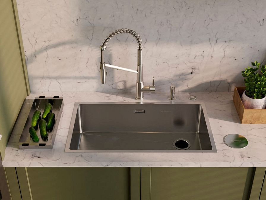 Мойка имеет уникальное покрытие PVD, которое обеспечивает дополнительную защиту от царапин и коррозии, сохраняя при этом привлекательный внешний вид. Установка мойки возможна тремя способами: интеграция сверху, интеграция снизу или накладной вариант, что позволяет выбрать наиболее подходящий способ в зависимости от особенностей кухонного интерьера.