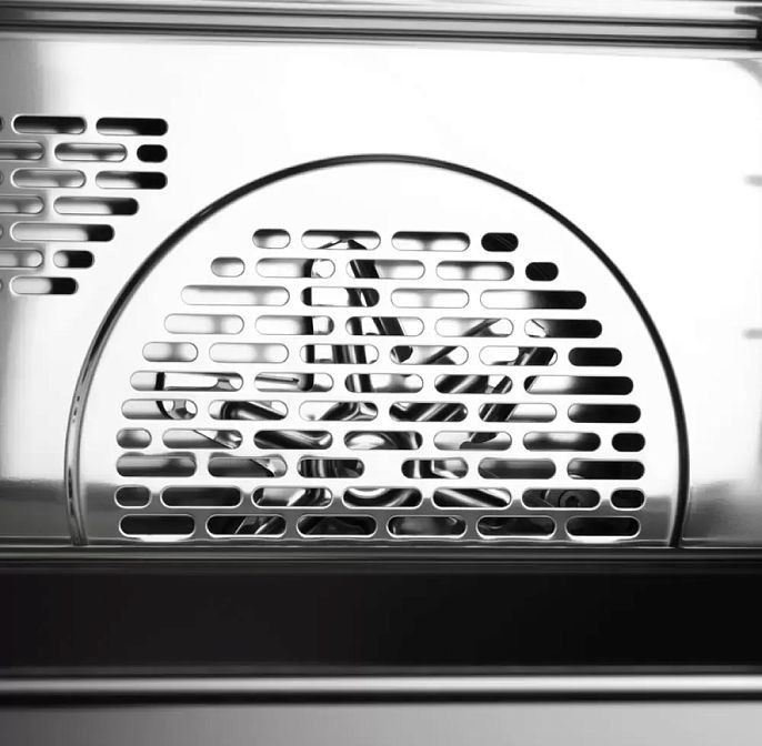 Управление реализовано через интуитивную панель с текстовым дисплеем и сенсорные переключатели: боковая клавиша включения расположена на корпусе для удобного доступа. Панель отображает текущее время, фактическую и заданную температуру, а индикация уровня воды помогает контролировать резервуар. Электронный программатор поддерживает память пользовательских настроек и широкий набор автоматических режимов: приготовление на пару, выпечка, разогревание, су-вид и конвекция — всего доступно множество программ и режимов для точного результата.