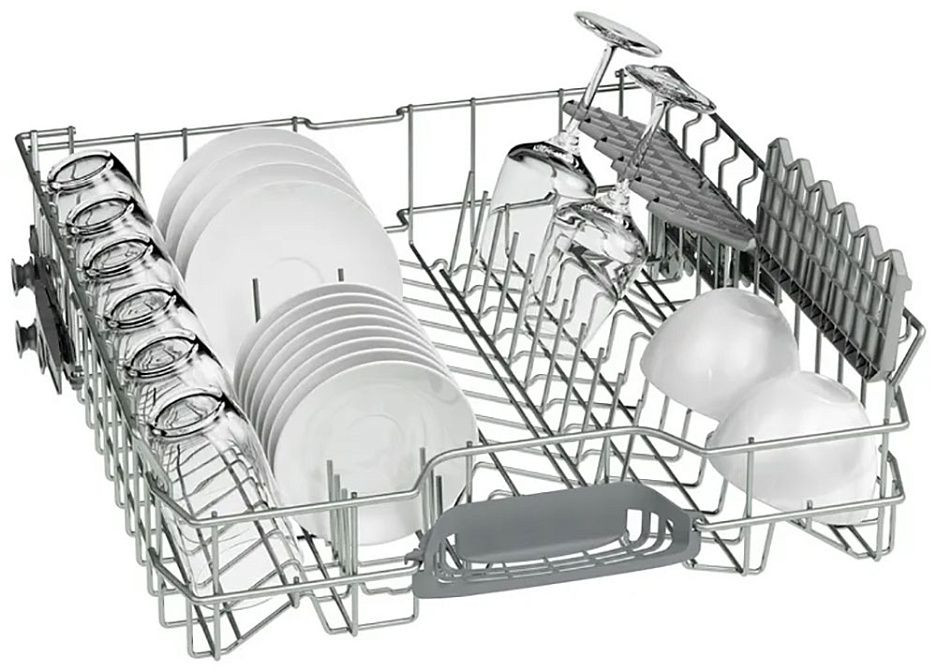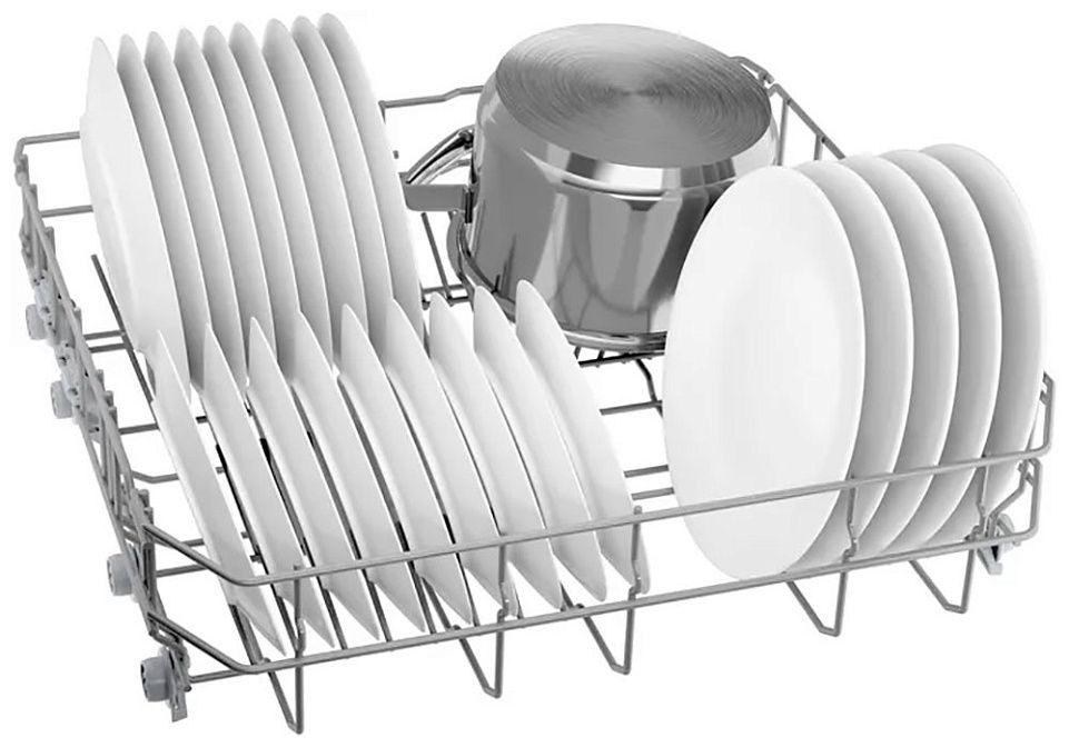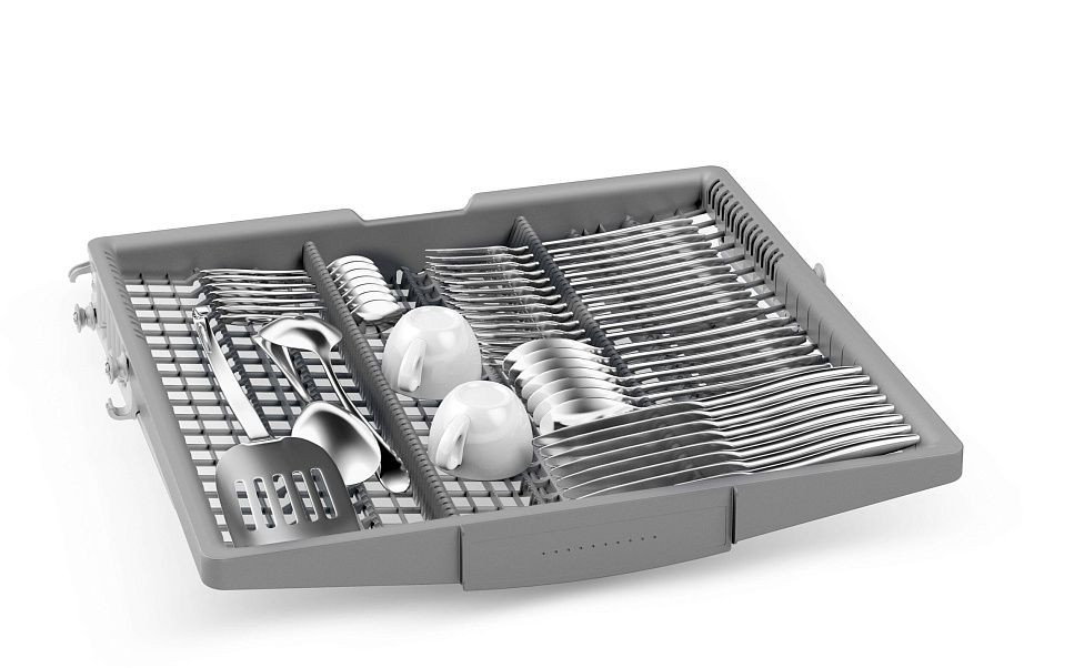 Ключевые преимущества- Полная интеграция под фасад с тремя корзинами и третьим уровнем для удобной загрузки до 13 комплектов посуды, экономя место и упрощая расстановку.