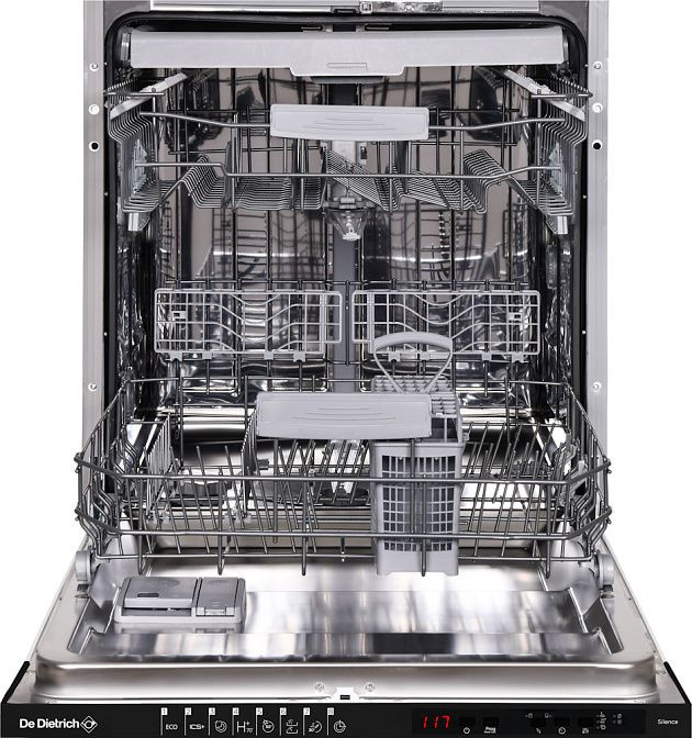 - Удобная полная встраиваемая конструкция с нержавеющим фасадом и тремя регулируемыми корзинами для разных наборов посуды.