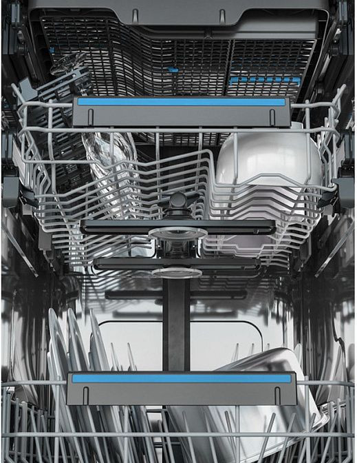 В комплект поставки входят верхняя и нижняя корзины с пластиковыми ручками, держателями для стаканов и складными зубцами. Это обеспечивает удобное размещение посуды различных размеров и форм. Верхняя корзина FlexiLift позволяет регулировать высоту под разные размеры посуды.