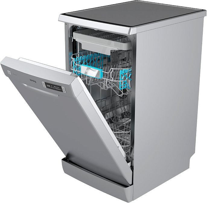 Внутренняя камера из нержавеющей стали сочетает долговечность и гигиеничность, рассчитана на 10 комплектов посуды и оснащена тремя корзинами, включая третий уровень для столовых приборов и мелких предметов. Регулируемая по высоте верхняя корзина, полка для чашек и складные направляющие для тарелок повышают гибкость размещения как больших кастрюль, так и хрупкого стекла. Поддон для столовых приборов обеспечивает удобство сортировки приборов, а наличие полки помогает оптимально распределять пространство при разной загрузке.