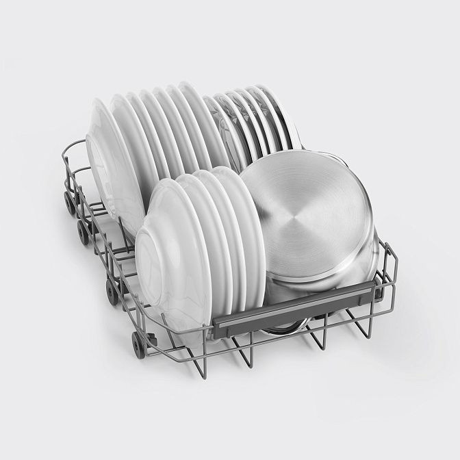 Внутренняя камера из нержавеющей стали гарантирует долговечность, гигиеничность и устойчивость к коррозии, а скрытый нагревательный элемент уменьшает вероятность образования известкового налета и облегчает уход. Съемный фильтр легко извлекается для регулярной очистки, поддерживая стабильную работу системы орошения. Вместимость рассчитана на 10 комплектов посуды, при этом продуманная конфигурация загрузки включает три уровня: верхняя корзина регулируется на два положения по высоте, что позволяет размещать как низкие чашки, так и более высокие предметы. Третий уровень предназначен для столовых приборов и мелких аксессуаров, а специальный съемный контейнер повышает удобство сортировки и дальнейшей выгрузки. Верхняя корзина допускает предметы высотой до 14 см, нижняя — до 31,5 см, что дает возможность использовать высокие кастрюли, формы и сковороды.
