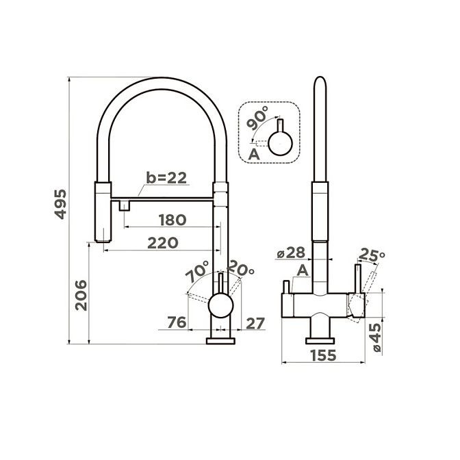 Смеситель Omoikiri Kanto-IB Latun/Indigo Blue оснащен аэратором и шланговым подключением, что обеспечивает его эффективную работу. Угол поворота излива составляет 360 градусов, что позволяет удобно использовать его для различных кухонных задач. Керамический картридж обеспечивает надежность и долговечность, а гибкие присоединительные шланги облегчают установку и подключение.