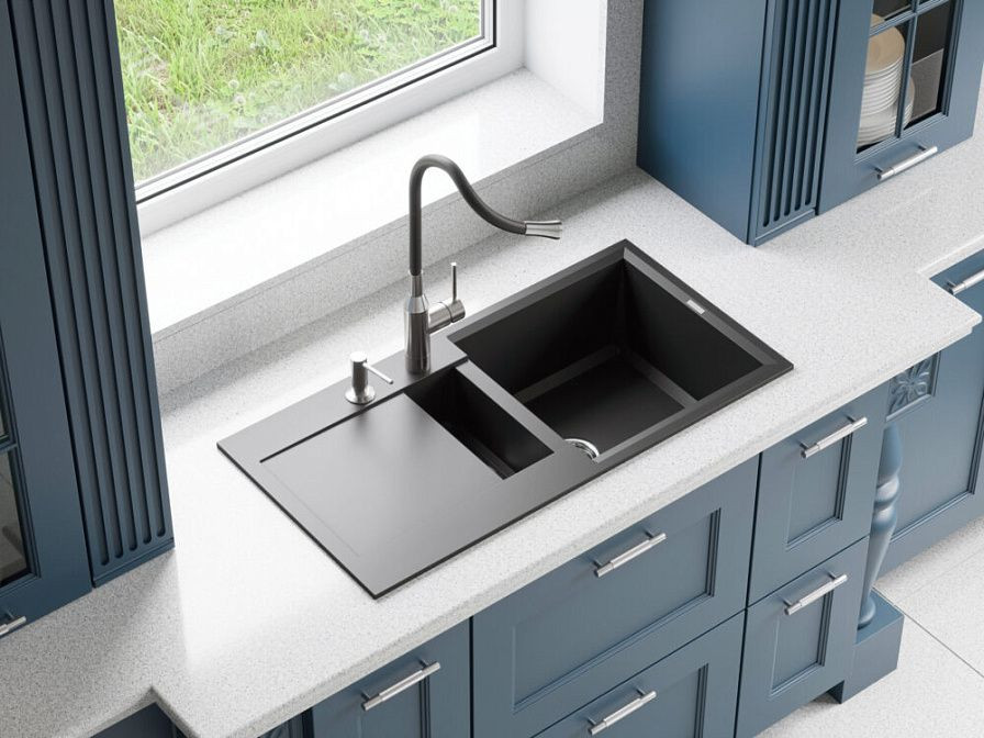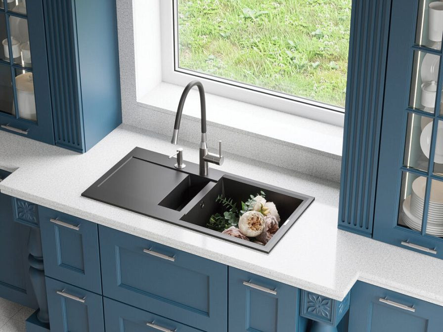 При установке на мойку он идеально вписывается в любой интерьер, а его размеры — 450x400 мм — позволяют удобно разместить его даже на небольшой кухне. Основная чаша имеет глубину 195 мм, что обеспечивает достаточно места для мытья посуды разного размера.