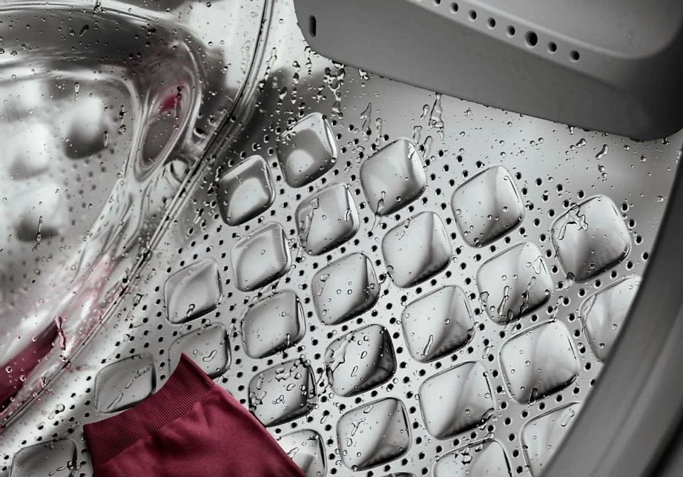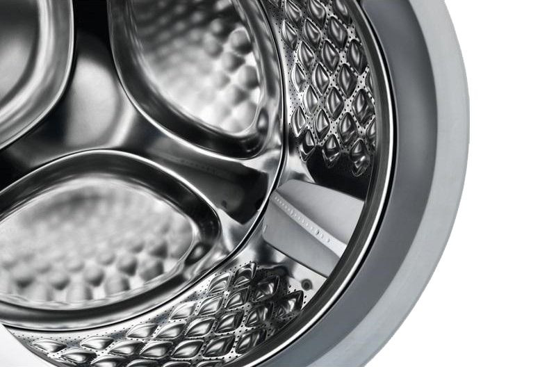 Современный корпус с элегантной белой отделкой создаёт аккуратный образ и легко вписывается в интерьер; фронтальная компоновка обеспечивает удобный доступ при загрузке до 8 кг белья. Высота 84,5 см, ширина 59,8 см и глубина 59 см делают прибор оптимальным для отдельно устанавливаемой зоны; при открытой дверце глубина увеличивается до 104,2 см, а угол раскрытия в 171 градус позволяет свободно манипулировать вещами. Прочный барабан из нержавеющей стали с рельефной поверхностью нежно обращается с тканями, а внутренний бак из пластика снижает вибрации и вес агрегата, который составляет 67,7 кг.