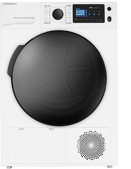 Выглядит современно и сдержанно: вертикальные пропорции 85x60x65,5 см, чистый белый цвет корпуса и белая дверца люка с прямоугольной формой подчеркивают минималистичную эстетику. Передняя панель выполнена из акрилового стекла, цвет панели управления — черный, а LED дисплей информирует о времени до окончания выбранной программы. Конструкция с поворотными регуляторами и сенсорными кнопками обеспечивает интуитивное управление, а наличие кнопок специальных функций позволяет сохранить любимые настройки в память (MyFavourite). Угол открытия дверцы до 180° и внутренняя подсветка барабана из нержавеющей стали повышают удобство загрузки и выгрузки, диаметр люка 37,5 см обеспечивает доступ даже для объемных предметов, а барабан Soft Drum бережно относится к тканям.