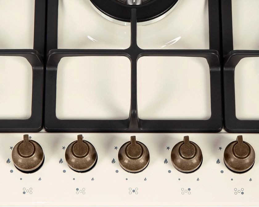 Материал поверхности панели — эмаль, что обеспечивает легкую очистку и долгий срок службы. Решетки выполнены из чугуна — материала, отличающегося высокой прочностью и долговечностью. Панель конфорок изготовлена из металла, что гарантирует ее надежность и долгий срок службы.