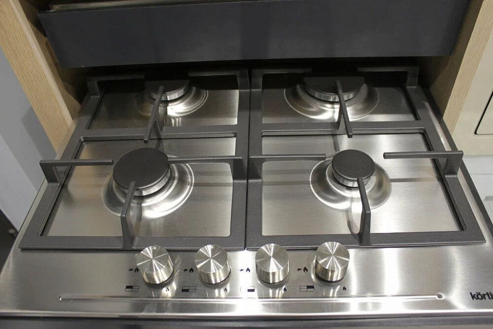 Управление механическое, с поворотными регуляторами из металла, расположено спереди для удобной настройки температуры без наклонов. Электроподжиг встроен в систему, а газконтроль обеспечивает автоматическое перекрытие подачи при затухании пламени, что повышает безопасность при эксплуатации как от магистрального природного газа, так и от сжиженного топлива. В комплект входят жиклеры для баллонного газа и адаптер для кофейника, предусмотрено подключение газа 1/2_. Центральное отключение и блокировка управления защитят от случайной активации, есть защита от детей и автоматическое отключение для дополнительного спокойствия.