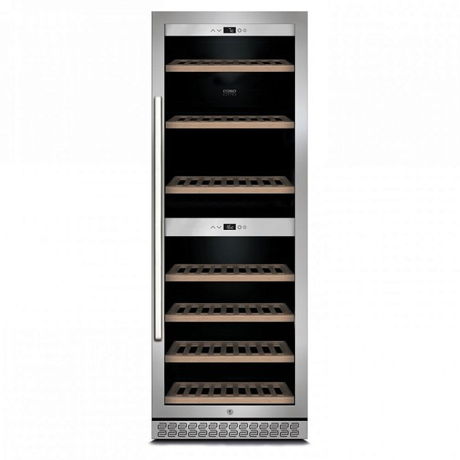 Внутреннее пространство организовано единым отсеком с семью уровнями хранения, где расположение съемных деревянных полок цвета черный адаптировано под стандартизованные форматированные бутылки — вместительность рассчитана на 126 единиц. Полки выполнены для удобного размещения и извлечения тары, при этом регулировка высоты и наклонные секции отсутствуют, что обеспечивает ровную и стабильную укладку рядов. Для аккуратного распределения холодного воздуха предусмотрен встроенный вентилятор, который равномерно поддерживает микроклимат в двух температурных зонах. Диапазон установки в верхней и нижней части варьируется от +5 до +20 °C, а единый набор режимов позволяет устанавливать оптимальные условия для хранения и созревания напитков.