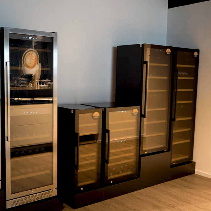 - Компактная встроенная конструкция из металла и стекла с UV_защитой обеспечивает элегантное оформление и сохранность напитков даже при прямом свете.