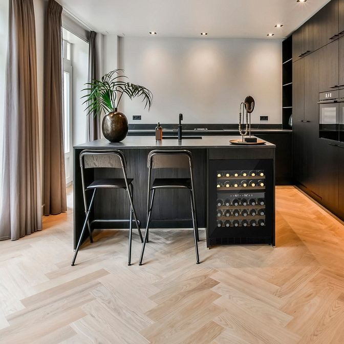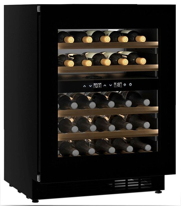 Элегантный встраиваемый винный шкаф выполнен в черном корпусе из металла и рассчитан на аккуратную интеграцию в кухонную нишу 820—880x600x580 мм. Прозрачная дверь с тройным изоляционным стеклом и УФ-фильтром сохраняет идеальный обзор бутылок, защищая напитки от вредного излучения, а ручки из нержавеющей стали подчёркивают премиальный облик. Внутреннее пространство организовано пятью выдвижными деревянными полками бежевого цвета, способными аккуратно разместить до 36 стандартных бутылок; полицы оснащены механизмом доводчиков для плавного извлечения и возвращения.