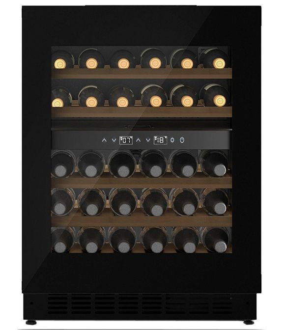 Интерьер дополняют угольный фильтр и LED_подсветка, эффектно подчеркивающая этикетки и фасады, при этом полки располагаются так, чтобы исключить наклонные установки. Диапазон регулировки температур в верхней и нижней зонах 5-20 °C позволяет адаптировать микроклимат под разные типы вин, при этом обеспечена независимая регулировка для двух зон. Конструкция предусматривает возможность перенавешивания дверей — стандартное открывание вправо с опцией смены направления — что делает шкаф гибким в планировке. Габариты 82,9x59,5x57,5 см и масса 53,5 кг обеспечивают стабильную установку в нише, длина кабеля 2 м и мощность подключения 120 Вт упрощают подключение.