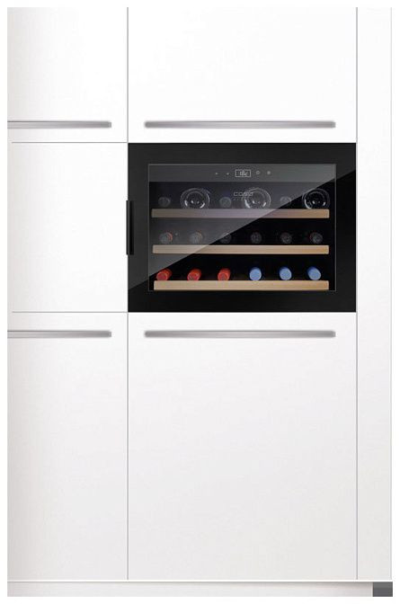 Эта модель представляет собой элегантный монотемпературный аппарат, выполненный в сдержанном черном оформлении и рассчитанный на размещение под столешницей или в нише с размерами 560—570x450x550 мм; при этом конструкция не предназначена для полного заподлицо встраивания, что сохраняет удобство доступа и упрощает установку. Узкий корпус (106,5x40x60 см) занимает минимум места, при этом обеспечивает внутренний объём 127 л и вмещает до 18 стандартных бутылок, аккуратно расставленных на трех выдвижных деревянных полках с черной отделкой. Полки выполнены так, чтобы бутылки легко извлекались и возвращались, при этом отсутствие регулировки высоты упрощает планирование постоянного хранения коллекции одного формата.