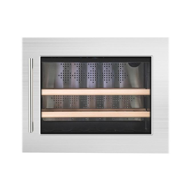 Элегантный вставной аппарат выполнен в стальном оттенке с стеклянной дверцей, защищенной от ультрафиолетового излучения, что сохраняет визуальную привлекательность бутылок и защищает напитки от фотоокисления. Компактный прямоугольный корпус гармонирует с современными кухонными и барными гарнитурами: стальные боковые стенки и черные деревянные полки создают контрастную, но сдержанную композицию. Ручки из стали черного цвета органично дополняют лицевую панель, а прозрачная поверхность дверцы обеспечивает легкий визуальный доступ к содержимому без необходимости открывать камеру.