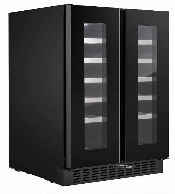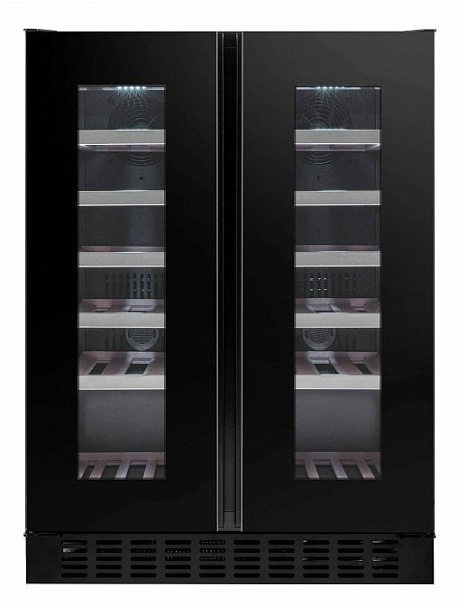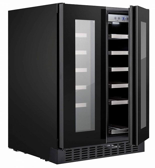 Сдержанный черный корпус из металла и прозрачная стеклянная дверца с защитой от УФ-лучей создают строгий, современный образ, идеально вписывающийся в интерьер кухни или встраиваемой зоны под столешницу. Внешняя отделка дополнена ручками из нержавеющей стали, удобными в использовании и выдержанными по стилю, а внутренняя светодиодная подсветка плавно подчеркивает бежевые деревянные полки, аккуратно расположенные на выдвижных направляющих с доводчиками. Стекло двери обеспечивает демонстрацию содержимого при сохранении стабильного микроклимата, а угольный фильтр и встроенный вентилятор равномерно распределяют свежесть по каждой из двух камер. Панель управления с сенсорными элементами и ярким дисплеем размещена внутри, что сохраняет лаконичность фасада и обеспечивает индикацию температуры без лишних деталей.
