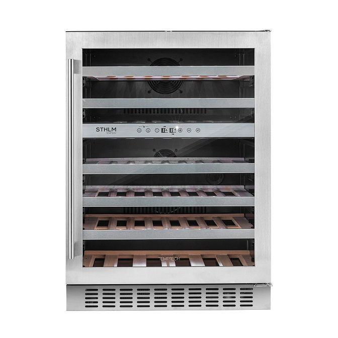 Элегантный встроенный прибор выполнен в строгом черном цвете и рассчитан на аккуратную интеграцию в кухонный гарнитур благодаря компактным габаритам 81,3x59,5x57 см и нише 605x590x820 мм. Передняя панель — стеклянная прозрачная дверца с защитой от УФ-лучей, которая сохраняет визуальный контроль за содержимым и одновременно препятствует воздействию ультрафиолетового излучения на вино. Ручки из стали и черные полки создают сдержанный современный образ, а боковые стенки из стали придают корпусу надежность и долговечность. Внутренняя светодиодная подсветка подчеркивает этикетки и облегчает выбор бутылок при недостаточном освещении.