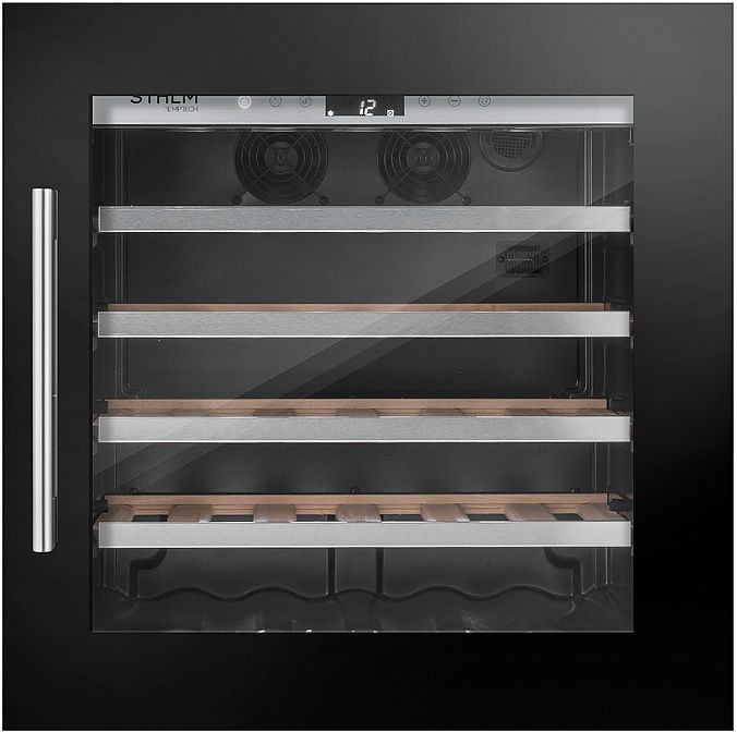 Корпус из металла и аккуратные ручки из нержавеющей стали подчеркивают современный образ, а внутренняя отделка полок выполнена из бежевого дерева — выдвижные платформы упрощают доступ к бутылкам и позволяют поддерживать порядок. Вместительность в 90 литров рассчитана на хранение до 30 стандартных емкостей, при этом пространство организовано одной температурной зоной с единственным режимом, управляемым сенсорной панелью, размещенной внутри камеры. Информативный дисплей и светодиодная подсветка создают комфорт при выборе нужной позиции и обеспечивают точное отслеживание текущей температуры.