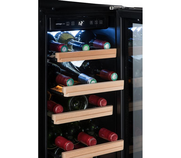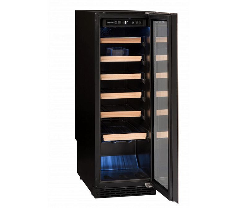 Холодильник оборудован шестью выдвижными полками из металла и дерева, на которых можно разместить до 24 бутылок вина. Полки не регулируются по высоте, но одна из них выполнена под наклоном, что позволяет удобно размещать бутылки разного размера. Встроенный вентилятор обеспечивает равномерное распределение температуры по всей камере, а антивибрационная система исключает вибрацию, которая может негативно сказаться на качестве вина.