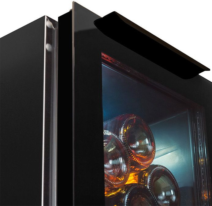 Холодильник оснащен одним компрессором и использует хладагент R600A. Дверь открывается вправо, но при необходимости можно изменить направление открывания. Стекло дверцы защищено от УФ-лучей, что предотвращает порчу вина под воздействием солнечного света.