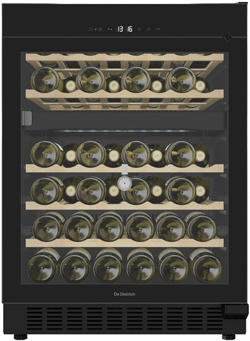 Встроенная конструкция рассчитана на нишу 825x600x575 мм, габариты самого прибора компактны: высота 82 см, ширина 59,5 см, глубина 57 см; длина сетевого кабеля 1,5 м и мощность подключения 18 Вт. Металлические боковые стенки и надежная сборка делают прибор долговечным, а регулировка ножек упрощает монтаж в рабочую поверхность. Светодиодная подсветка внутри создает мягкую экспозицию бутылок, а прозрачная дверь с УФ-защитой предотвращает деградацию напитков под воздействием света.