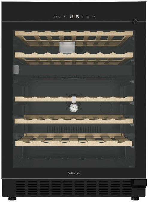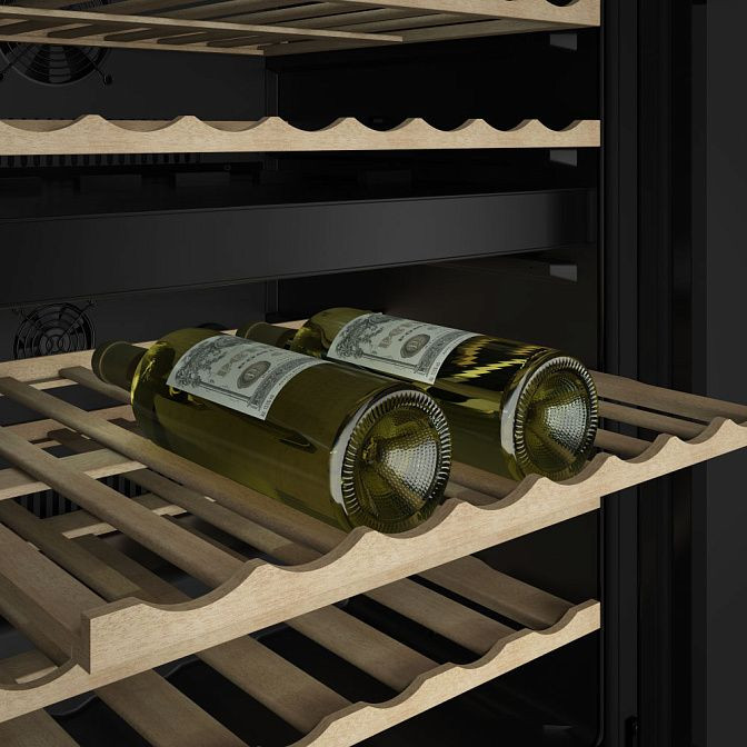 Элегантный встроенный винный шкаф в черном металлическом корпусе сочетает сдержанную эстетику и продуманную функциональность: прозрачная стеклянная дверца с защитой от УФ-лучей демонстрирует коллекцию, а скрытые ручки и серебристые металлические элементы подчеркивают стиль. Бежевая деревянная полочная система с выдвижными разделителями рассчитана на 46 бутылок и обеспечивает аккуратное хранение, при этом конструкция полок облегчает извлечение емкостей. Панель управления с дисплеем расположена на дверце для удобного контроля и настройки параметров, при этом интерфейс электронного управления интуитивно понятен и не нарушает визуальную гармонию фасада.